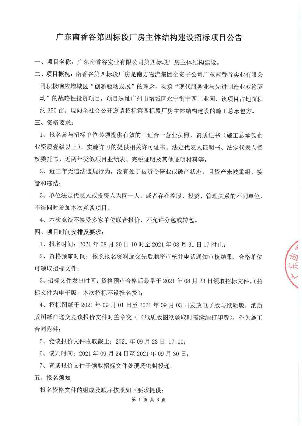 南香谷第四标段厂房主体结构建设招标项目公告